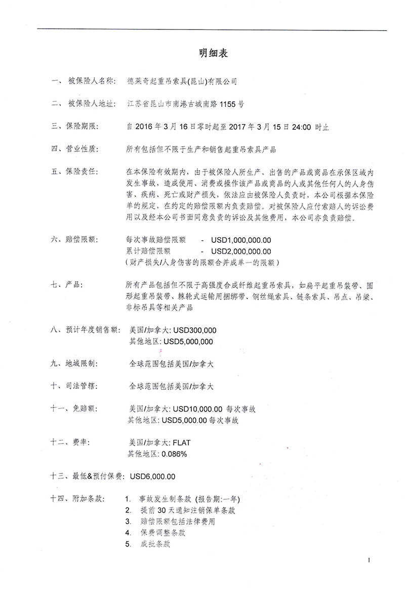 德國多來勁吊具太平洋保險(xiǎn)公司產(chǎn)品責(zé)任險(xiǎn)